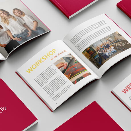 Zur Umsetzung führten wir einen Druckworkshop in Zusammenarbeit mit der Lebenshilfe Hallein durch. Dort gestalteten die Teilnehmer:innen eigene Werke, die den Kern des Projekts bilden. Die Ergebnisse wurden in einem Kunstbuch dokumentiert, das sowohl den kreativen Prozess als auch die fertigen Arbeiten präsentiert. Miriam Krutter übernahm das Corporate Design und die Fotografie, Sarah Wimmer das Editorial Design und Merchandise, und Elena Wohlstreicher die Social-Media-Strategie sowie die begleitende Printkampagne.