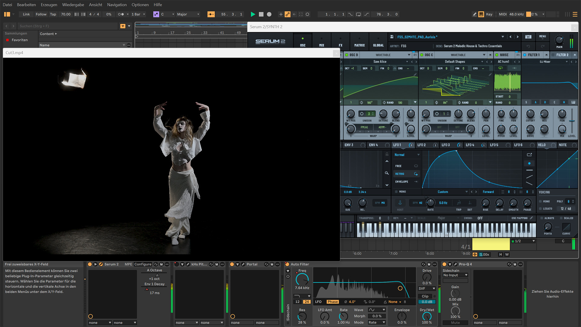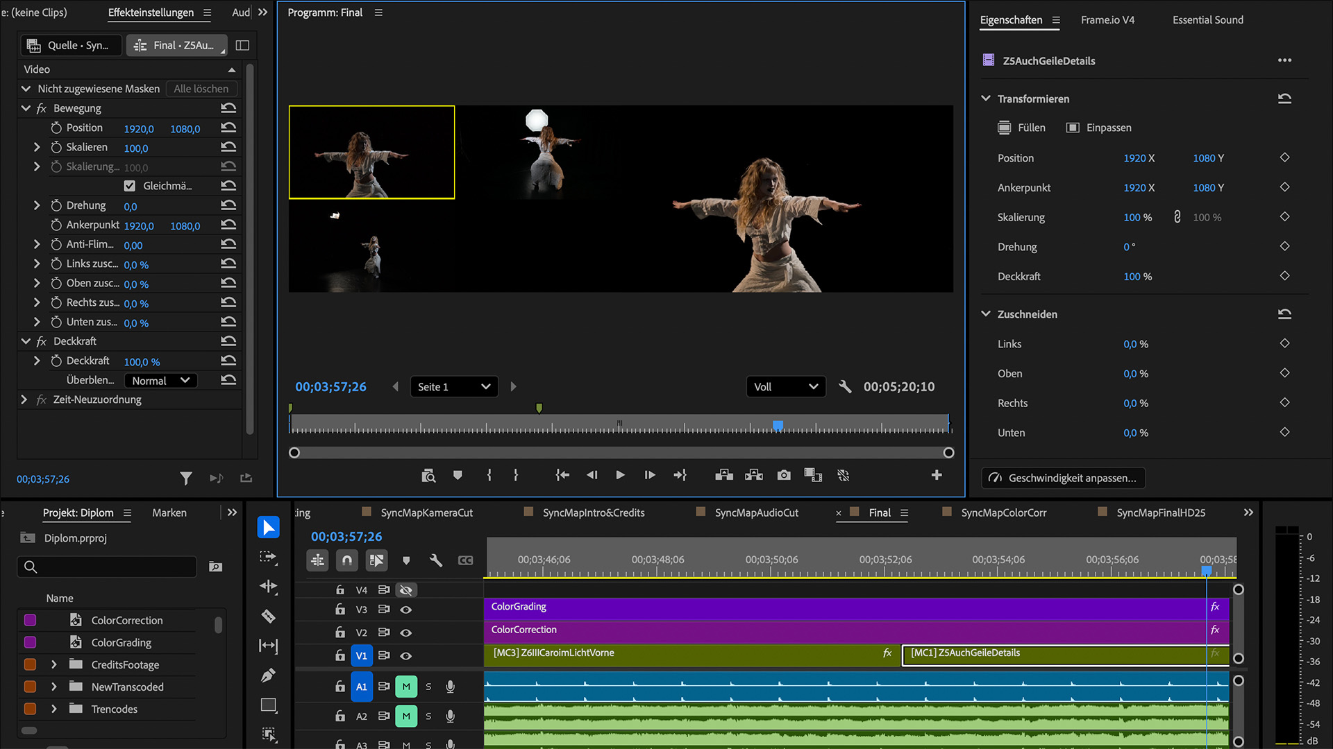 zwischenBlicken untersucht, wie Tanzperformance und Motion-Tracking-Technologie Mittel zur feministischen Selbstermächtigung werden können. Dazu wurde ein Kurzfilm produziert, in dem menschliche Bewegungen einer Tänzerin über Motion-Tracking in Elemente der Filmmusik übersetzt wurden. Die technische Umsetzung der bewegungskontrollierten Klänge erfolgte mittels einer Software-Architektur, bestehend aus Tracking- und Musikprogrammen (MediaPipe, TouchDesigner, Ableton Live). Die Methodik umfasste eine theoretische Analyse feministischer Perspektiven (Mulvey, Frederickson & Roberts, Young) sowie Kamera-, Schnitt- und Lichttechniken. Darüber hinaus wurden fünf zeitgenössische Tanzperformances und der Film Black Swan (Aronofsky) analysiert, um zu ermitteln, wie Kamerarbeit im Kontext von Performance-Kunst erfolgt und welche Klänge verwendet werden könnten, um die emotionale Wirkung auf das Publikum zu verstärken.